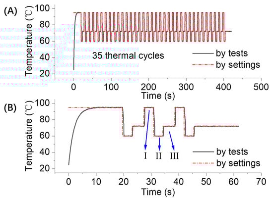 Figure 2A shows the temperature profile of 35 ultra-fast photothermal heating/cooling cycles within 7 min. Here, we define the time-average heating/cooling rate as the value calculated by measuring the temperature difference between successive temperature maxima and minima and then dividing it by their time intervals. From the experimental data determined via tests, the heating and cooling rates of our system were around 10 °C/s and 8 °C/s, respectively. In general, temperature control is the critical factor in PCR for efficient DNA amplification. Thus, most commercial PCR thermal cyclers use the thermoelectric cooler (TEC) component to perform fast heating and cooling thermal cycling. For example, as reported in Ref. [], the heating and cooling rates of the TEC Peltier element were about 8.3 °C/s and 8 °C/s, respectively. Recently, Ling et al. [] proposed a gradual thermal conductivity design to increase the temperature uniformity, and they reached average heating/cooling rates of 5.52 and 5.28 °C/s, respectively. Demonstrating the limits of this method, their heating/cooling rates were around 7.2 and 6.12 °C/s, respectively. Compared with the heating and cooling rates of the PCR thermal cycler using the thermoelectric cooler effect or water-cooled or air-cooled effect [,] above, the device proposed in this work shows a significant improvement in both the heating and cooling processes.
