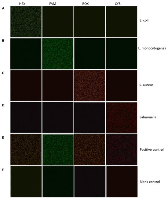 In Figure 3, from left to right are the fluorescence images from the HEX, FAM, ROX, and CY5 channels, respectively. From top to bottom are the fluorescence images of target DNA template from (A) E. coli, (B) L. monocytogenes, (C) S. aureus, (D) Salmonella, and (E) positive control templates containing all the four kinds of foodborne pathogens, as well as (F) blank control reagents using buffer only. It can be seen in Figure 3A that the E. coli-positive template is positive in the HEX channel only. Correspondingly, the L. monocytogenes-positive template is positive in the FAM channel only, the S. aureus-positive template is positive in the ROX channel only, and the Salmonella-positive template is positive in the CY5 channel only.