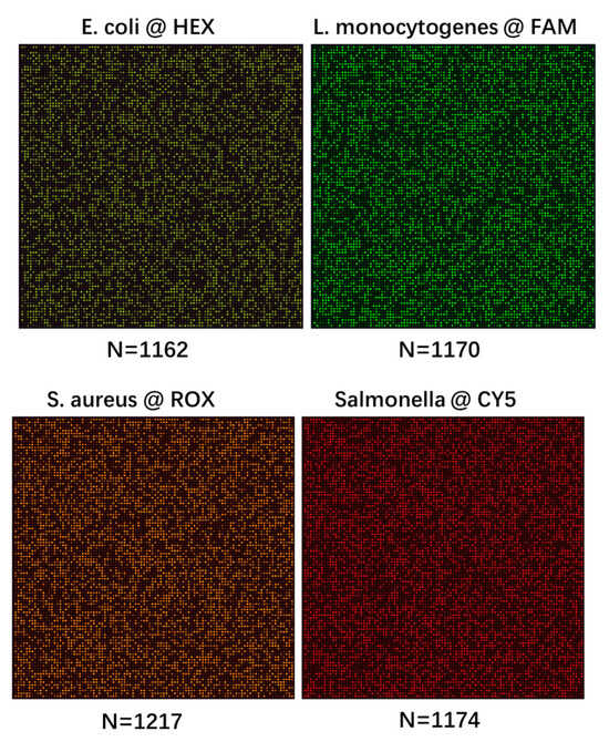 To verify the quantitative analysis capability of our method, Figure 4 shows the experimental results of four kinds of foodborne pathogens, as well as four fluorescence channels with DNA concentrations of ~1200 copies/μL. As shown in Figure 4, the positive chamber of each pathogen is 4600 for E. coli, 4622 for L. monocytogenes, 4754 for S. aureus, and 4634 for Salmonella. There are 100 × 100 chambers in the nested digital PCR chip; thus, the calculated target DNA numbers of the above pathogen templates are 1162 copies/μL, 1170 copies/μL, 1217 copies/μL, and 1174 copies/μL, respectively. The experimental results verify the quantitative capability of the nested digital PCR chip.