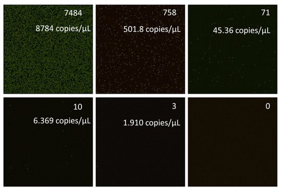 On the other hand, we diluted the DNA templates of E. coli and conducted a quantitative analysis under concentration gradients. As shown in Figure 5, the first PCR test (with E. coli primers and in the HEX channel) was conducted using the initial DNA template extracted from the beef powder. It can be seen that there were 7484/10,000 positive chambers detected in the nested digital PCR test. Based on the calibration equation of the Poisson distribution, the calculated DNA concentration of the E. coli pathogen in the beef was 8784 copies/μL. After a 0.1× dilution, the calculated E. coli DNA decreased to 501.8 copies/μL. Moreover, the calculated E. coli DNA concentration was only 1.910 copies/μL for the 0.0001× dilution of the food samples. For more diluted food samples, the chip gave negative results, probably because the 100 × 100 nested digital PCR chip does not allow us to detect such a low limit of detection.