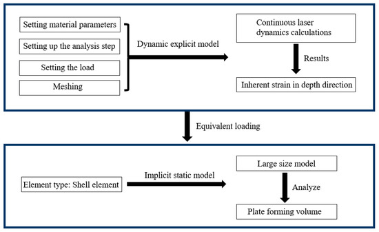 The modeling process of laser shock forming is shown in Figure 2. Firstly, a dynamic display model is established using Python to set the material parameters, analysis time steps, loads, and grids. Then, a dynamic analysis using a small number of spots is performed to calculate the intrinsic strain in the depth direction. Finally, the obtained intrinsic strain is applied to the implicit static model using Python, and the forming amount of the plate after laser shock is predicted through static analysis.