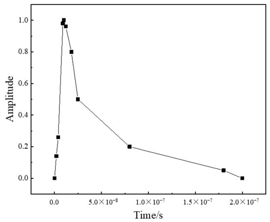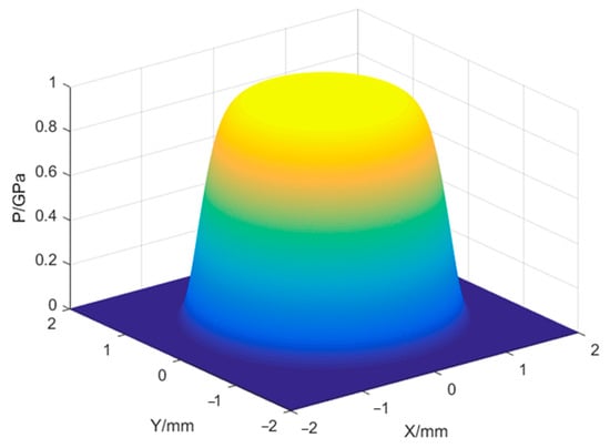 where P is the shock wave pressure; Pmax is the peak pressure of the shock wave (the expression is shown in Equation (4) [19]); P(x, y) is the spatial distribution of the shock wave pressure (the specific expression is shown in Equation (8)), Figure 3 is the spatial distribution of the laser shock wave pressure; P(t) is the temporal distribution of the shock wave pressure, and the temporal amplitude curve is shown in Figure 4 [20].