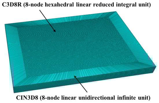 Python parameters can be used to create model geometry, followed by the selection of C3D8R (8-node hexahedral linear reduced integral unit) as the element type for the laser impact area, with a size of 0.18 mm and a depth of 0.09 mm. To avoid stress wave reflection, infinite element CIN3D8 (8-node linear unidirectional infinite unit) can be selected as the stress wave reflection boundary on the boundary of the laser impact area. The number of grid divisions is 598,000, and the finite element model after grid division is shown in Figure 7. The size of the laser shock model as well as the shock path are shown in Figure 8.
