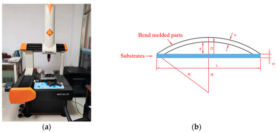 After the plate is laser impacted, the plate will be bent to a certain extent. In this thesis, the coordinates of the deformed flat plate are measured using a coordinate measuring machine, and the calculated bow arc height is compared with the numerical values obtained from the simulation model in order to calibrate the bending and forming volume of the plate and to verify the accuracy of the finite element model. The three-coordinate measuring machine is shown in Figure 9a, and the measurement principle is shown in Figure 9b. The aluminum alloy’s plate thickness is h, the thickness of the substrate is H, the length of the substrate is L, the radius of curvature of the plate after bending is R, the length of the substrate L is 300 mm, the height of the arc bow is d, and the maximum distance between the bending plate and substrate is D.