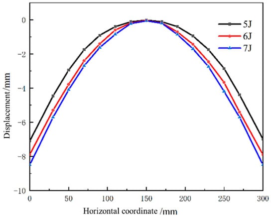 The laser pulse width is 20 ns, the spot size is 3 mm, the spot overlap rate is 30%, the plate thickness is 4 mm, and the Nd:YAG laser shock device is used to perform laser shock forming on the aluminum alloy 6082-T6 plate with energies of 5 J, 6 J, and 7 J, respectively. Figure 10 shows the simulation results of the bending and forming volumes of aluminum alloy 6082-T6 under different laser energies, and the arc bow heights are 6.6 mm, 7.2 mm, and 7.6 mm under laser energies of 5 J, 6 J, and 7 J, respectively.
