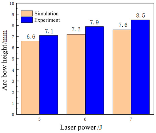 Comparison of 6082-T6 aluminum alloy arch height simulation and experiment at different laser energy levels.