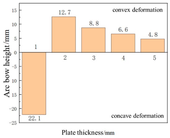 Arching height of aluminum alloy 6082-T6 flat plates with different plate thicknesses.