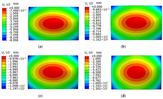 Simulation diagram of plate deformation under different spot sizes. (a) Spot 1 mm; (b) spot 2 mm; (c) spot 3 mm; (d) spot 4 mm.