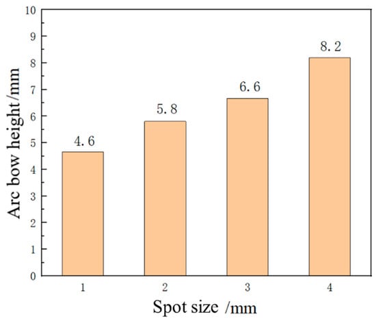 The laser energy is 5 J, the laser pulse width is 20 ns, and the thickness of the aluminum alloy 6082-T6 sheet is 4 mm. Under the condition that the other parameters remain unchanged, the aluminum alloy 6082-T6 sheet is subjected to impact forming using spot sizes of 1 mm, 2 mm, 3 mm, and 4 mm, respectively. The distribution curve of plastic strain in the thickness direction is shown in Figure 18. The trend of plastic strain curve changes similarly with the increase in spot size, and the plastic strain value increases correspondingly. Due to the maximum plastic strain on the impact surface and the minimum plastic strain on the bottom surface, the sheet bends in a convex shape. Figure 19 shows the simulation diagram of the sheet under different spot sizes. The arc height of the sheet under different spot sizes is 4.6 mm, 5.8 mm, 6.6 mm, and 8.2 mm, as shown in Figure 20. It can be seen from the figure that with the increase in spot size, the degree of sheet deformation also increases. This is because the shock wave formed by a large spot size propagates as a plane wave, while the shock wave formed by a small spot size propagates as a spherical wave. Plane waves attenuate slower during energy transmission, which can generate larger residual pressure stress and larger forming amounts on the sheet. In contrast, spherical waves attenuate faster during energy transmission, resulting in smaller residual pressure stress and smaller forming amounts on the sheet. In practical applications, the bending forming amount of the sheet can be adjusted by controlling the size of the spot.