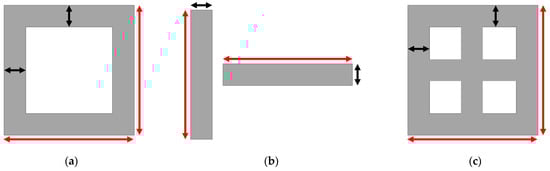 Representation of the empty square (a), single wall (b) and partitioned square (c) designs, where black arrows represent the thickness (t) of the walls and red arrows represent the length (L) of the walls.