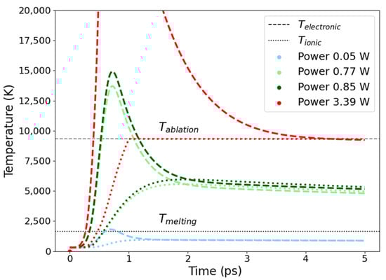 As observed in Figure 3, for the case in which the power is 0.05 W, the lattice temperature does not reach the melting point, resulting in no material melting. On the other hand, for power of 3.39 W, if the temperature surpasses the critical threshold, we will observe ablation. Therefore, choosing the appropriate power level is critical for successful melting.