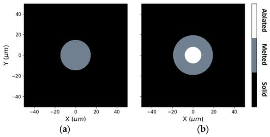 To obtain the optimal conditions inside the melting regime, a simulation based on the Two-Temperature Model was conducted []. This model postulates the existence of two distinct temperatures in the ultrafast laser–material interaction.