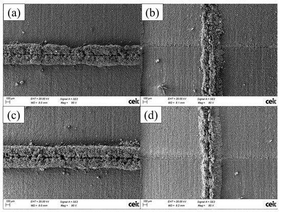 A collection of different structures was fabricated with wall thickness values ranging from 5 µm (which corresponded to a single scanning line in some of the cases []) to 1 mm, in multiple steps. Figure 5 shows the results of the 5 µm ((a) and (b)) and 10 µm ((c) and (d)) walls from the empty square designs. In the 5 µm wall, the formation of smooth volumes of melted powder are visible with almost no adherence to non-melted particles, although they are not melted in a single continuous structure. In the 10 µm wall, when the scanning directions are perpendicular, the results are similar; in contrast, for the parallel processing, the wall is more uniformly and continuously melted. In both processes the multiple void areas can be explained due to a lack of melted powder in the lower levels, making it impossible to form a stable powder layer when processing successive stages.