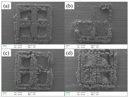 In Figure 7, the set of pictures shows the effect of increasing the wall thickness using the first set of parameters (A). In 5 μm wall thickness structures, there is a lower layer of powder in the base, as observed in Figure 7a, resulting from a very subtle powder cleaning process to try to avoid any damage; when performing a stronger cleaning process, damage can occur, as seen in the top-left corner of Figure 7b. As the wall thickness increases, the strength of the wall increases, becoming less easily damaged during cleaning and permitting stronger powder extraction, which results in clean bases and less powder around the structures; this strengthening is depicted in Figure 7c,d. Finally, with 50 μm walls, the widest and presumably the strongest structures are obtained, which allow the powder to be trapped and make them the least tidy structures among these four.