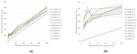 (a) Comparison between the theoretical and measured wall thicknesses. (b) Augmented view of the comparison between the theoretical and measured wall thicknesses below 100 µm. The red dashed line represents the 1:1 ratio for Ms:Th, for equal value of theoretical and measured wall thicknesses. Measurement techniques used: in blue OM measurements, in orange OP measurements and in green SEM measurements.