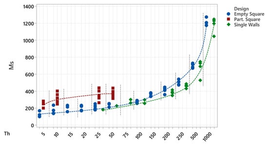 Comparing the different structures, the first conclusion that can be taken is the influence of the design in the final thickness value. The lowest wall thickness values were obtained for empty square designs, which makes sense as these were the group covering a wider range of thickness values. Despite this, single walls present lower values in the 200–1000 μm range; below the 200 μm value and down to 25 μm—the lower limit of single walls—the results tend to converge on the same line. Partitioned square designs, which were only tested in four thickness values, present notably higher measured wall thicknesses, around 200 μm more than empty square designs.