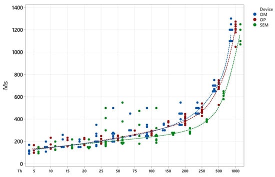 Differences between measuring techniques lie in the interpretation of the images and in the measurement systems of each technique. Analysing the independent values together (shown in Figure 10), it can be observed that all of them follow a similar tendency with different degrees of stability on their values. SEM measurements provide the lowest thickness values out of the three techniques; conversely, optical microscope measurements (OM) return the highest values recorded. Both microscopy techniques present great variability in central (25–50–75 μm) values of wall thickness, which are the results of the measurements in a range of 400 μm in thickness, more than four times the original thickness value. Optical profilometry (OP) has the smallest deviation along the whole set of measurements, with some exceptions for satellite values in the largest structures. Moreover, and as a result of the averaging of the data collected in the topographic map of each wall, OP thickness values are located between the values obtained with both microscopy techniques, above SEM and below OM data; due to this, optical profilometry data are understood to be the most reliable.