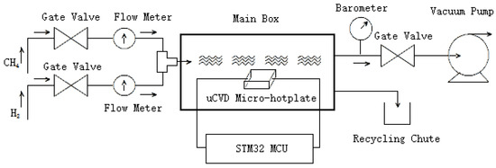 The uCVD graphene preparation system is developed by referring to existing CVD systems [19,23] and optimizing the design. Although the basic principles of preparation are the same, the system described in this paper has the characteristics of being fast, convenient, compact, and low cost, making it more suitable for the needs of research institutes, universities, and factory laboratories. The system diagram is shown in Figure 2.