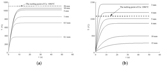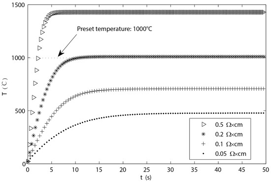 In the above equations, , and represent the initial temperature and final temperature of the nth heating period, °C. The simulation curves of heating temperature under different resistivity are shown in Figure 4. When the simulation conditions are within certain parameters (input current 1.1 A), the length and width of the micro-hotplate are both 5 mm, the thickness of the Si, SiO2, and Cu layers are H1 = 300 μm, H2 = 1 μm, and H3 = 25 μm, and the material emissivity is referred to in references [24,25]. The simulation curves of heating temperature under different resistivities of silicon layers are shown in Figure 4.