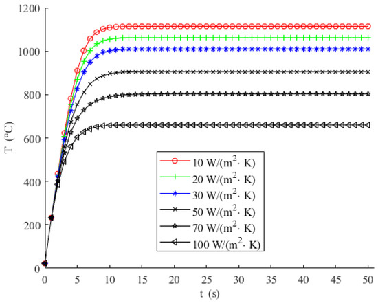 It can be seen from Figure 6 that during the heating stage, the effects of different convective heat transfer coefficients (corresponding to the gas flow rates) on heating performance are approximately the same. However, in the constant temperature stage, the gas flow rate is inversely related to the maximum achievable heating temperature. That is, a higher maximum achievable heating temperature can be obtained at a small flow rate (corresponding to a small convective heat transfer coefficient), and conversely, a lower maximum achievable heating temperature may even make it impossible to meet the synthesis process requirements.