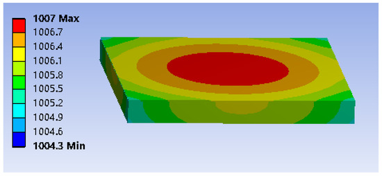 To verify the temperature characteristics of the SOI-based micro-hotplate mentioned above, we conducted thermoelectric simulation using the same size parameters (the resistivity of the conductive Si layer is 0.2 ·cm) on the commercial software Ansys 2021.R1. The results are shown in Figure 7.