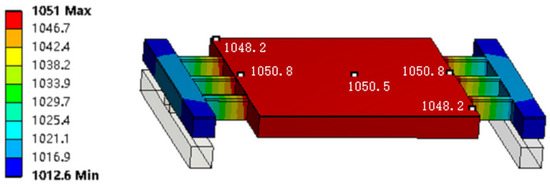 The electrical and mechanical stability of the device structure should be considered as well due to the drastic temperature and surrounding airflow changes that occur in micrometer-scale devices in a short period. In this paper, a thermal–electric model of ANSYS Workbench is used to analyze the impact of structure and material resistivity on the heating performance of the micro-hotplate. Computer simulation is widely used in the design of MESM devices [22]. It can not only provide verification for theoretical design but also provide convenience for optimized design and improve design efficiency. The thermal–electric simulation of ANSYS Workbench has flexible structural design functions and convenient material parameters and environmental convection parameters settings. Setting the resistivity of the heating chip and cantilever Si to ·cm and ·cm, respectively, the device length and width are both 5 mm; the convective heat transfer coefficientunder is 20 W/(m2·k); a constant current (1 A) is inputted, the temperature on the heating chip surface can reach 1050.8 °C, and the maximum temperature difference at different points on the surface is less than 2 °C, which effectively meets the requirements for the CVD growth of graphene using Cu as the catalyst, shortens the preparation time, and improves the consistency of the produced graphene.