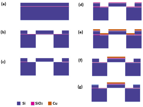 A simplified fabrication process flow for the suspended multi-cantilever micro-hotplate is illustrated in Figure 10. In this fabrication process, an SOI wafer is used as a temporary carrier with a thickness of 500 μm and a Si resistivity of 0.2 ·cm (Figure 10a). Subsequently, using the prepared mask, the photolithography process is used to cover the required mask pattern on the SOI, and the DRIE process is used to etch away the excess silicon in the top and bottom substrates (Figure 10b). Then, SiO2 in the cantilever region was etched with HF (Figure 10c). Next, a 1 μm thick SiO2 layer was deposited on the surface of the device using the LPCVD system (Figure 10d). Afterwards, a 25 μm thick Cu layer was grown on the surface of the device using an electron beam evaporation process (Figure 10e). After that, the same process technology as Figure 10b,c is used to etch away the Cu and SiO2 on the cantilever (Figure 10f). Finally, using the doping process, boron ions are doped on the surface of the cantilever (with a doping depth of 50 μm), resulting in a Si resistivity of 0.004 ·cm on the surface of the cantilever (Figure 10g).