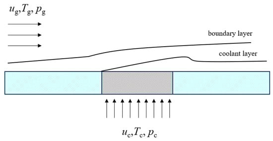 Divergent cooling is an efficient cooling method. Research on its technology began in the 1940s [] and was first applied to rocket engines. In 1990, National Aeronautics and Space Administration (NASA) summarized several new cooling schemes and pointed out that divergent cooling was the most promising cooling method. Since then, divergent cooling technology has received more attention in various aerospace powers and is considered to be the most likely cooling technology to address the extremely harsh thermal environment of the liquid rocket engine thrust chamber and to provide thermal protection for the key components of hypersonic vehicles. The divergent cooling of porous media can be regarded as a limiting method of film cooling, with a small pore size and a dense pore distribution (see Figure 1, arrows on the left indicate mainstream gas, arrows below indicate cold gas). The cooling medium flows out from micropores of the porous material in the opposite direction of the heat flow, and the cooling medium is uniformly transported to the whole high-temperature surface using the good heat transfer performance of the porous material. The cooling medium exchanges heat with the porous material, which absorbs the heat and reduces the overall temperature of the porous medium skeleton. At the same time, a continuous and evenly distributed film structure is formed on the high-temperature surface, which separates the high-temperature surface from the main-stream gas, thereby reducing the surface temperature of the hot end and effectively improving the cooling efficiency and coverage area of the cooling medium. This cooling method has the theoretically optimal cooling efficiency of all cooling methods.