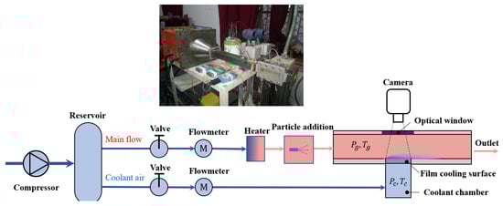 In this study, a divergent cooling particle deposition experimental platform was built, as shown in Figure 2. The experimental platform mainly included the following systems: a gas supply system (which supplied the mainstream and cold air flow), a heating system, an experimental section system, a temperature and pressure measurement system, and a data acquisition system.