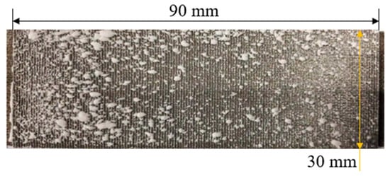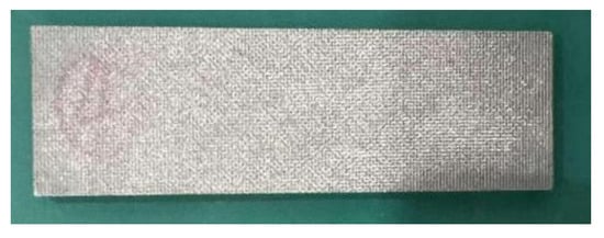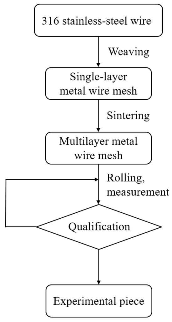 The sintered metal wire mesh experimental pieces used in this study were manufactured by Beijing Jingming Powder Metallurgy Co., Ltd. in Beijing, China, and were made of twill dense metal wire mesh. The main reason was that its structure was compact, there were many solder joints, and its strength was better than those of other woven forms of wire mesh. Figure 3 shows the surface structure of the mesh obtained by scanning electron microscopy. The processing of the sintered metal wire mesh is shown in Figure 4. The raw material of the experimental mesh was 316 stainless-steel wire. The metal mesh was woven into a single-layer mesh by Dutch mesh weaving, and then the multi-layer mesh was interlaced and sintered in a vacuum high-temperature furnace to form a multi-layer sintered metal mesh. Through the rolling process, plastic deformation and thickness were reduced, and porosity and average pore size were also reduced. By continuously adjusting the magnitude of the applied load during the rolling process, the sintered metal wire mesh with the required parameters was finally obtained. The sintered metal mesh used in this study had 20 layers, the porosity was 55.1%, and the average pore size was 93.7 μm. Figure 5 shows the plate test piece used in this experiment.