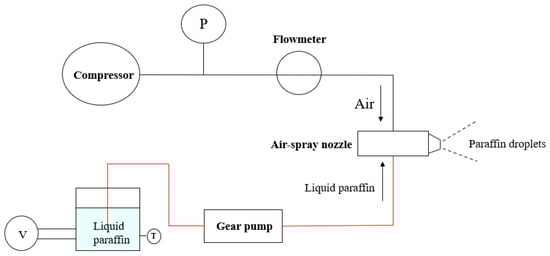 The phase-change energy storage material, paraffin, was selected as the target particle for the particle deposition experiments to simulate particles in the flow channel of the aero-engine turbine system, and the corresponding particle injection system was designed, as shown in Figure 6. The particle injection system included a jet device, an air pipe, and a liquid pipe (the red line in the figure). The liquid path was used to transport the liquefied paraffin to the air atomizing nozzle through the gear pump, while the gas path provided the compressed air required to atomize the liquid paraffin. The liquid paraffin and compressed air converged in the air atomizing nozzle and then ejected the paraffin particles in the form of droplets.