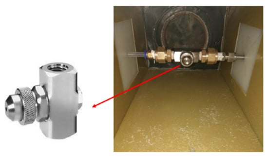In the process of the spray experiment, due to heat loss during the process of paraffin flowing through the pipeline, in order to prevent paraffin solidification, some pipelines were designed as copper pipes, with a heating film on the outer wall of the copper pipe to ensure the patency of the flow channel. Moreover, the gas path of the spray system was pre-mixed with paraffin liquid inside the nozzle. To prevent paraffin from solidifying and blocking the nozzle on the inside, copper pipes were also installed in the gas path pipeline and attached to the heating film. By preheating the air, the circulation of the whole spray system was ensured during the experiment. In this experiment, the air atomizing nozzle produced by Spry Spray System Co., Ltd. in Shanghai, China was selected, as shown in Figure 7. A pressure spray device was formed by pipeline connections. By adjusting the gas–liquid mass flow ratio, the liquid paraffin could be separated into particles with the sizes required for the experiment. Paraffin (solid at room temperature) was stored in a pressure tank and melted by a heating device. The liquid paraffin was pumped into the copper tube from the pressure tank by a gear pump and flowed into the nozzle. It was mixed with the hot air transported by the gas path inside the nozzle and was sprayed into the main stream after being atomized by the nozzle. The installation position of the air atomization nozzle in the main-stream channel is shown in Figure 7. The particle size produced by the spray system was measured by a Malvern particle size meter and was mainly two sizes, 20.75 μm and 55 μm.