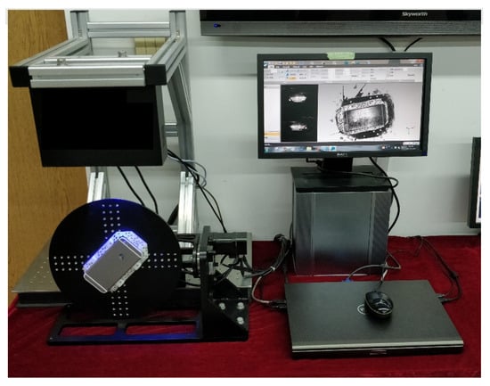 To obtain the distribution of particle deposition on the divergent cooling wall, a binocular grating projector was used to measure the plate and obtain the spatial distribution of the particle deposition. The principle of the device was mainly based on the stereo-vision method of shape recovery based on the principle of dual-view geometry. The images collected by two cameras from different perspectives were used for feature extraction and stereo-matching. Finally, the binocular parallax principle was used to restore the shape of the object. The main steps of the binocular grating projection were camera calibration, projection grating image acquisition, grating image phase unwrapping, feature point matching, and reconstruction of the three-dimensional point cloud based on the epipolar geometry principle. Figure 8 shows a photograph of the binocular grating projector.