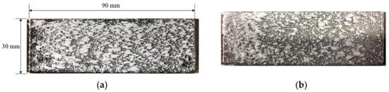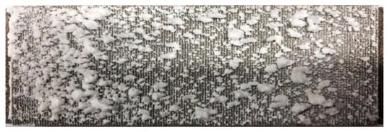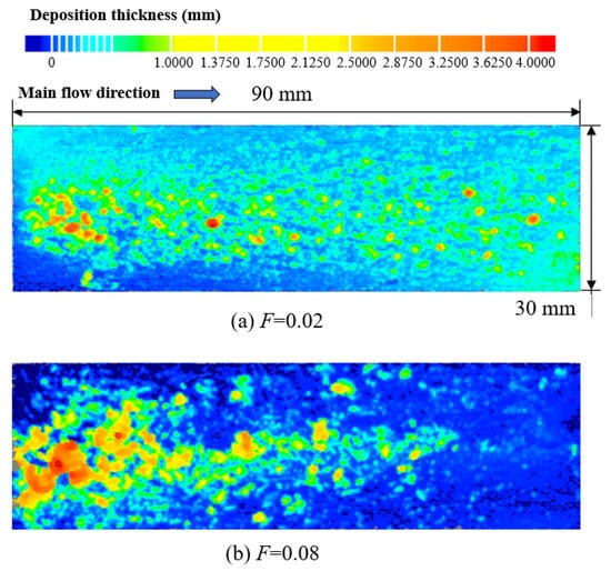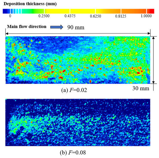 Figure 10 shows the deposition distributions for two particle concentrations when the total particle injection amount was constant. It can be seen that although the total particle injection amount was the same on the current divergent cooling wall, deposition distributions were quite different. At the large particle concentration (Experiment 1), more large deposition blocks formed on the wall, and the distribution of deposition blocks was dense, as shown in Figure 10a. At the low particle concentration (Experiment 2), as shown in Figure 10b, the distribution of sedimentary blocks was relatively sparse. Combined with the deposition results of Table 1 and Figure 10, it is also shown that the deposition amount with a high particle concentration was larger on the current divergent cooling wall.