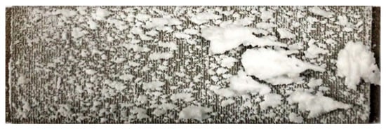 The evolution of the deposition state with the increase in the spray time was evaluated by comparing Experiments A, B, and C. The experimental conditions are shown in Table 2. Figure 11, Figure 12 and Figure 13 show the deposition distributions of the sintered metal wire mesh divergent cooling wall for different spray times. It can be seen that deposition distributions were similar, while deposition thicknesses were significantly different. When the spray time was short, as shown in Figure 11, the deposition was relatively thin, and the deposition amount upstream of the divergent cooling wall was greater than that downstream. As the spray time increased, the deposition thickness of the entire wall increased significantly. As shown in Figure 12, the deposition thickness in the downstream area was closer to that in the upstream area. When the spray time reached 5 min, as shown in Figure 13, many thicker sedimentary blocks were formed, and the coverage area of the sedimentary blocks was significantly increased. For the results of Experiment C, Figure 13 shows that there was a large deposition accumulation downstream of the divergent cooling wall, but not upstream. In fact, under the conditions of a 5 min spray, there were also a large number of large deposition blocks on the upstream divergent cooling wall. However, due to the thickness of the deposited layer being too large, it was peeled off when the experimental part was disassembled, leading to the results shown in Figure 13.