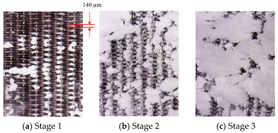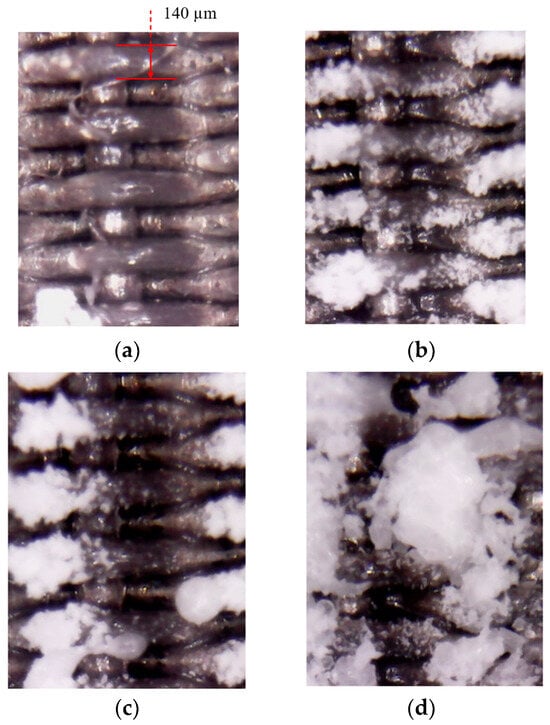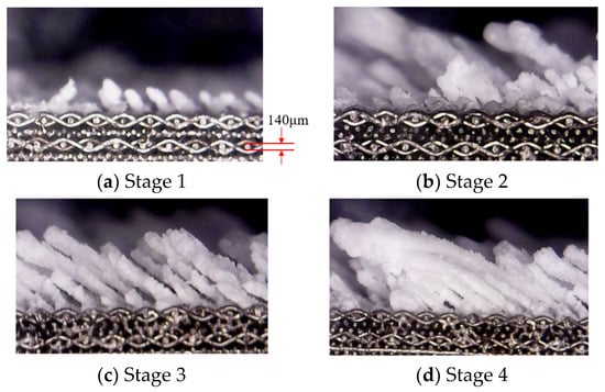 The formation of large deposition blocks on the divergent cooling wall can be observed from the pore scale. Figure 14 and Figure 15 show the evolution of the deposition state of the sintered metal wire mesh wall, with time under different magnifications. It can be seen that, as spray time increased, large deposition blocks were formed by the gradual increase in the amount of sediment on the adjacent metal wires and the fusion after contact. In the initial stage of deposition, particles could easily deposit on the upper surface of the windward side of the metal wire mesh, as shown in Figure 15b. As spray time increased, the deposition on the surface of the metal wire increased, and the deposition on the windward side of the metal wire gradually diffused from the center to both sides, as shown in Figure 15c. When the spray time continued to increase, the deposition blocks on the surface of the metal wire extended to both sides, connected with the deposition blocks of adjacent metal wires, and gradually merged together to form a large area of deposition blocks, as shown in Figure 15d.