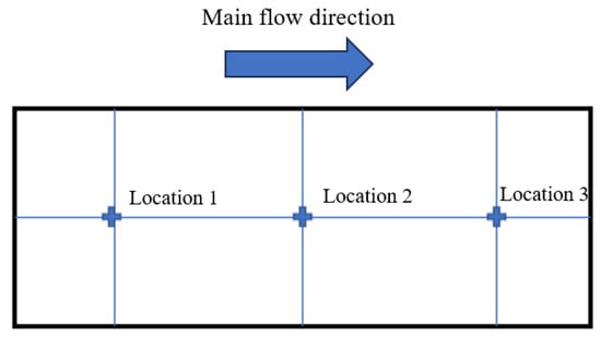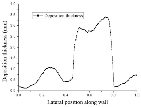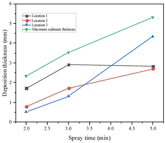 For the three sets of experiments, 5 mm × 5 mm areas were selected to measure the deposition thicknesses at three positions on the divergent cooling wall, as shown in Figure 17. These deposition thickness measurements are plotted in Figure 18. Moreover, the maximum deposition thickness of the wall after different spray times was also measured. The results showed that sediment thickness increased with an increase in the spray time, which was approximately linear. Position 1 was upstream of the divergent cooling wall, and the deposition thickness was the greatest in this area. The deposition thickness at position 3 in the downstream area was much lower than that in the upstream area when spray time was short, but as spray time became increasingly longer, the deposition thickness at positions 1 and 3 became closer. It can also be seen from the statistics of the maximum deposition thickness that the thickness of the sediment increased with the increase in spray time. The deposition thickness at position 1 decreased after a long time because of shedding of the deposition block.