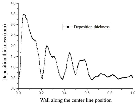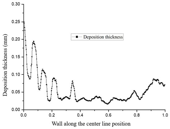 Figure 22 and Figure 23 show the distribution trends of the deposition thickness along the center line of the divergent cooling wall after two spray times. It can be seen that, with the increase in spray time, the distribution of the particle deposition was closer to the temperature distribution on the surface of the metal mesh. This was because the cooling air flow on the surface of the mesh covered the surface of the metal mesh to form a gas film under the action of the main stream. The leading edge of the metal mesh was the first to contact the main stream, and the cooling air flow was the smallest at the leading edge position. Along the main stream direction, the cooling air flow gradually accumulated, the gas film gradually thickened, and the cold protection effect of the mesh was more evident. The molten particles in the main stream were more viscous at higher temperatures and were more likely to adhere to the surface of the metal mesh and deposit. Further, due to the thicker gas film at the back of the screen, the resistance to particle deposition was greater. Under the combined influence, the deposition thickness was smaller than that of the front edge of the screen.
