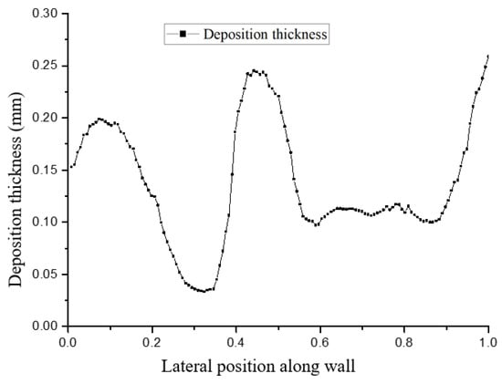 It can also be seen from Figure 22 and Figure 23 that there were significant fluctuations in the deposition thickness distribution of the divergent cooling wall. The divergent cooling test piece in this study was a sintered metal woven mesh, which was a porous metal material with complex and interconnected pore channels. After deposition, the deposition layer covered the cooling hole of the metal braided mesh. The deposition coverage of the divergent cooling wall was not formed at the same time but gradually became uniform with the deposition process, transitioning from dispersed to uniform. The difference in deposition thickness caused by the uneven distribution of deposition in adjacent areas led to a significant difference in the degree of blockage between the two adjacent areas. In areas with thicker sediments, flow resistance was greatly increased. However, in the adjacent downstream area, deposition thickness decreased sharply, so the flow resistance in this area was much smaller. The significant difference in flow resistance led to the redistribution of the cooling medium flow. The cooling medium flow rate through the sedimentary depression area was much higher than that in the upstream severe blockage area and even higher than that in the non-deposition area. The large increase in the cooling air flow rate in this area, in turn, inhibited the deposition of subsequent particles, while in the adjacent upstream area, particles were more likely to deposit, thus causing significant fluctuations in the deposition thickness of the adjacent area.