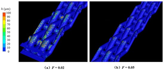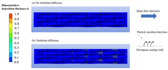 Figure 30 shows the influence of turbulent diffusion on the deposition of 5 μm particles. The incident direction of the particles was at a certain angle to the divergent cooling wall. Figure 30 shows the deposition distribution without considering the turbulent diffusion; that is, ignoring the influence of turbulent velocity fluctuations on particle motion. At this time, there was no deposition on the wall, indicating that the inertia of the particles themselves was not sufficient to overcome the time-averaged motion of the cold air jet and reach the wall. When the influence of turbulent diffusion was considered, particle deposition could easily occur on the main-stream windward surface of the wire mesh.