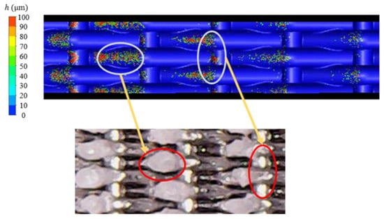 It can also be seen from Figure 16 that the formation of large deposits on the wall of the sintered metal wire mesh was not only due to the gradual increase in the deposits on adjacent metal wires perpendicular to the flow direction but was also related to the gradual fusion of deposits on two adjacent winding units of metal wires in the flow direction. The counter-main-stream growth of downstream sediment was increasingly inclined downward due to the motion of the sediment, so that it was increasingly closer to the upstream sediment. As spray time increased, upstream and downstream sediments eventually merged together.