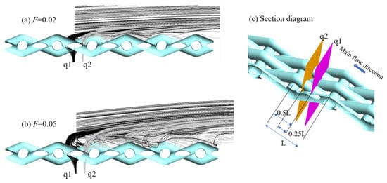 Three-dimensional streamlines of transverse sections p1 and p2 in the middle areas of the metal mesh under different blowing ratios.