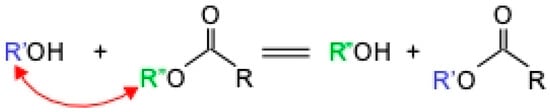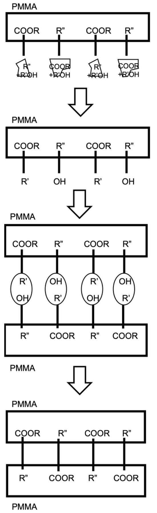 The solvents used were pure alcohol, pure acetone, and a mixture of alcohol and acetone. After several tests (alcohol/acetone = 2:1, 1:1, and 1:2), a solvent ratio of 1:1 was found to result in the best performance. To fuse two PMMA surfaces, the PMMA surfaces were lightly solvated by a mixture of solvents at a certain proportion before contact. This process is called transesterification, in which the ester group R″ is replaced by an alcohol group R′. According to the specific reaction mechanism, the R′-group of R′-OH in an organic solvent replaces the R″-group on PMMA to generate new esters and alcohols. The reaction formula is shown in Figure 1 [25]. In these reactions, acid or base catalysts can also be added for catalytic reactions. The organic solvent used in the reaction is limited to alcohols or ketones, so this reaction is also called the alcoholysis reaction.