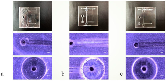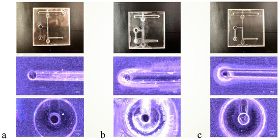 Illustration of microchannel conditions in PMMA Specimens under a bonding pressure of 30 N in various solvents. Optical microscopy (OM) 50× images demonstrating the effect of each bonding solvent: (a) alcohol, (b) acetone, and (c) an alcohol–acetone mixture. These images highlight the presence of bubbles at the PMMA bonding interfaces. Notably, compared with the individual solvents, the alcohol–acetone mixture resulted in a markedly reduced number of bubbles. (scalebar = 1 mm).
