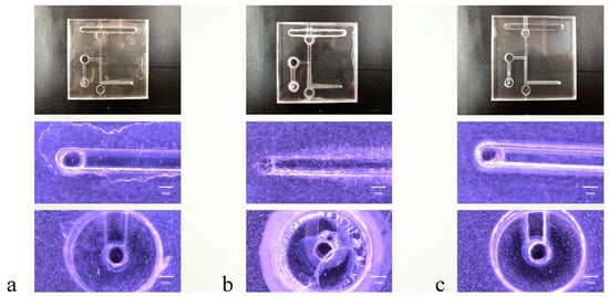 Microchannel status of PMMA specimens under a bonding pressure of 40 N in diverse solvents. Optical microscopy (OM) 50× images showing the impacts of each solvent: (a) alcohol, (b) acetone, and (c) a mixture of alcohol and acetone. Minor cracks are observable around the microchannels compared to the results obtained with a bonding pressure of 30 N (scalebar = 1 mm).