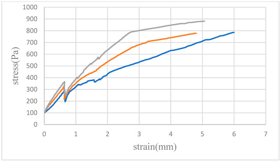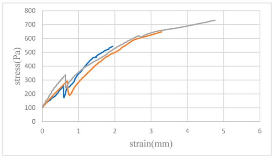 Tensile testing of bonded PMMA pairs and the results of measurements at a bonding pressure of 40 N. The graph displays three distinct curves for the solvents used: blue for alcohol, orange for acetone, and gray for the mixed solvent. Compared to the results obtained at a bonding pressure of 30 N, each curve here demonstrates not only an increase in rupture strength for all solvents but also a more pronounced deformation. Notably, the separation between the three curves is more substantial, indicating a clearer distinction in the performance of the sample in each solvent under increased bonding pressure.