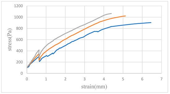 Tensile testing of bonded PMMA pairs and the results of measurements at a bonding pressure of 30 N. The graph shows three distinct curves corresponding to the solvents used: blue for alcohol, orange for acetone, and gray for the mixed solvent. Notably, the gray curve indicates enhanced ductility and superior rupture strength in comparison to those for the other solvents.