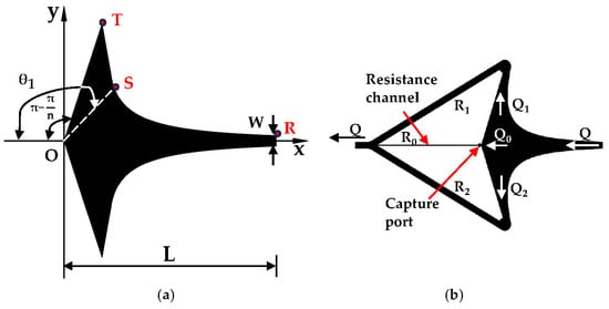 Subsequently, a microchamber capture section featuring a fluid stagnation point is constructed, with its symmetry axis aligned along the X-axis. The upper and lower boundary curves coincide with two symmetrical flow lines, satisfying the following boundary equations [].