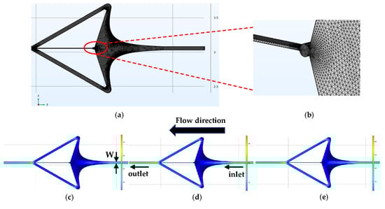 Flow velocity profile. (a) Meshing diagram. (b) View of capture port. (c) Inlet flow rate of 60 μL/min. (d) Inlet flow rate of 80 μL/min. (e) Inlet flow rate of 120 μL/min.