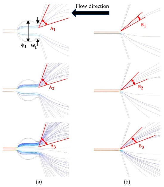Streamline comparison diagram. (a) Three streamlines with circular capture ports. (b) Three streamlines without circular capture ports.